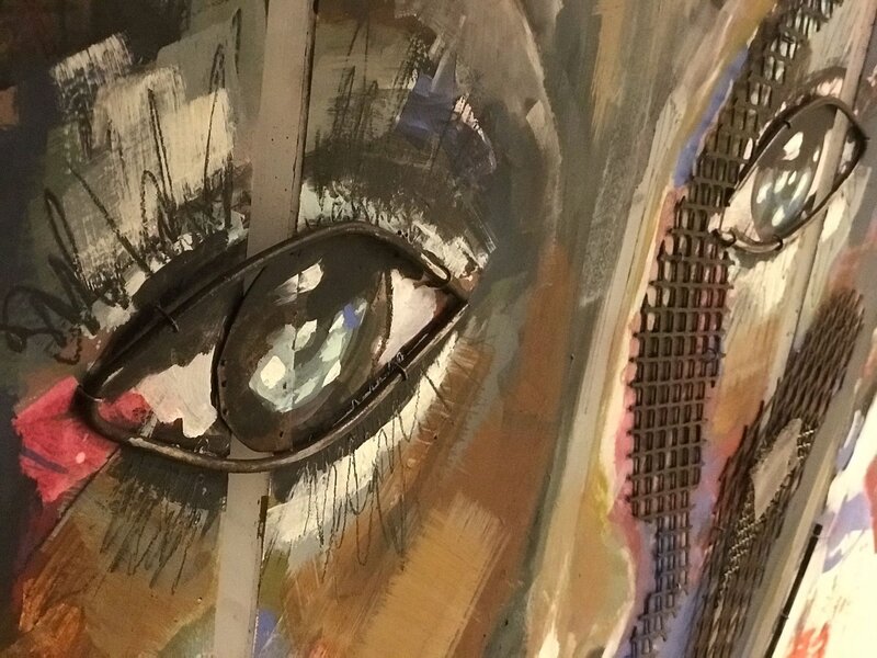 (P16) A collaboration piece with sculptor, Mambakwedza Mutasa, infusing steel and oil painting reflecting loyal friendship.